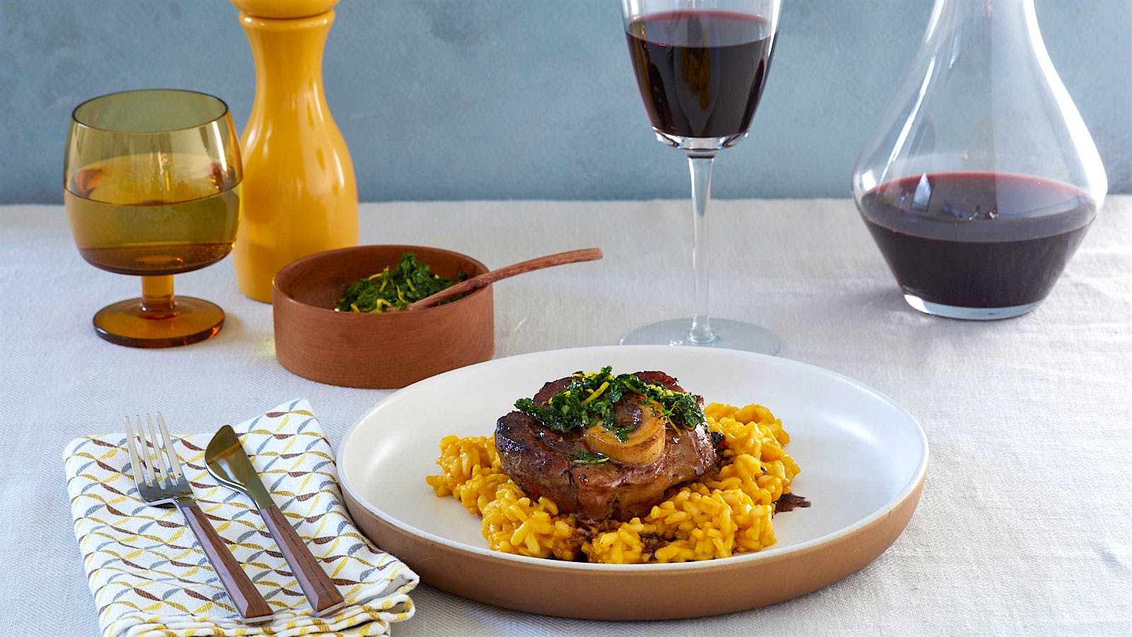 7. Remove the veal from the oven; it should be just warmed through. Spoon some risotto onto each of four dinner plates and top each with a veal shank. Spoon some sauce over the veal, and top with the gremolata and a drizzle of olive oil. Serves 4.